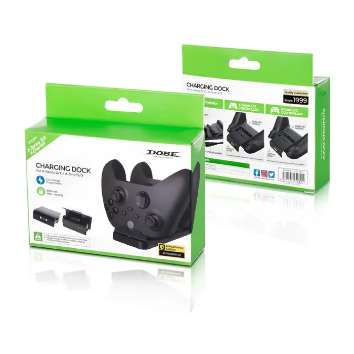 شرکت شناخته شده Dobe که در تولید لوازم جانبی می باشد به تازگی محصول پایه شارژر و باتری Dobe عرضه کرده که دارای قابلیت جایگاه شارژ همزمان کنترلرهای ایکس باکس : که شامل دو عدد کنترلر جدید ایکس باکس سریز و سازگار با کنترلر ایکس باکس وان و سری جدید کنترلر ایکس باکس با مدت زمان شارژ ۲ الی۳ ساعت و دو باتری قابل شارژ با ظرفیت 800 میلی آمپر ساعت می باشد.